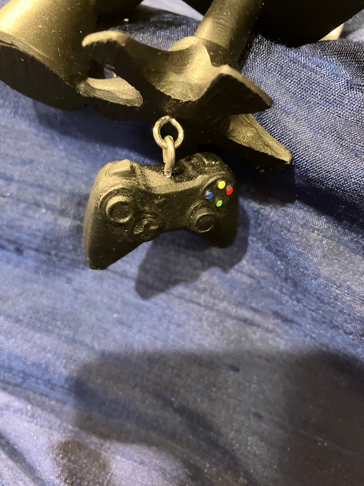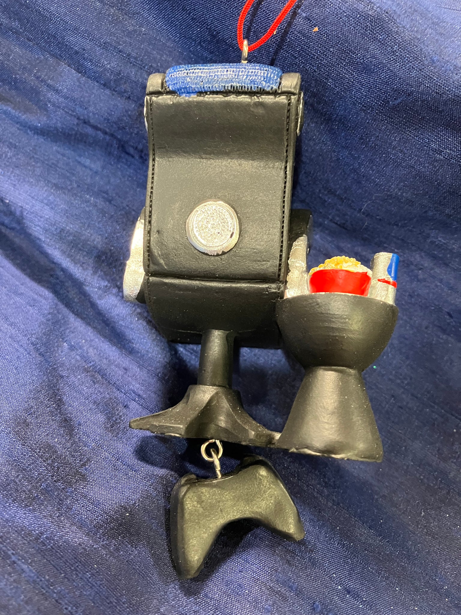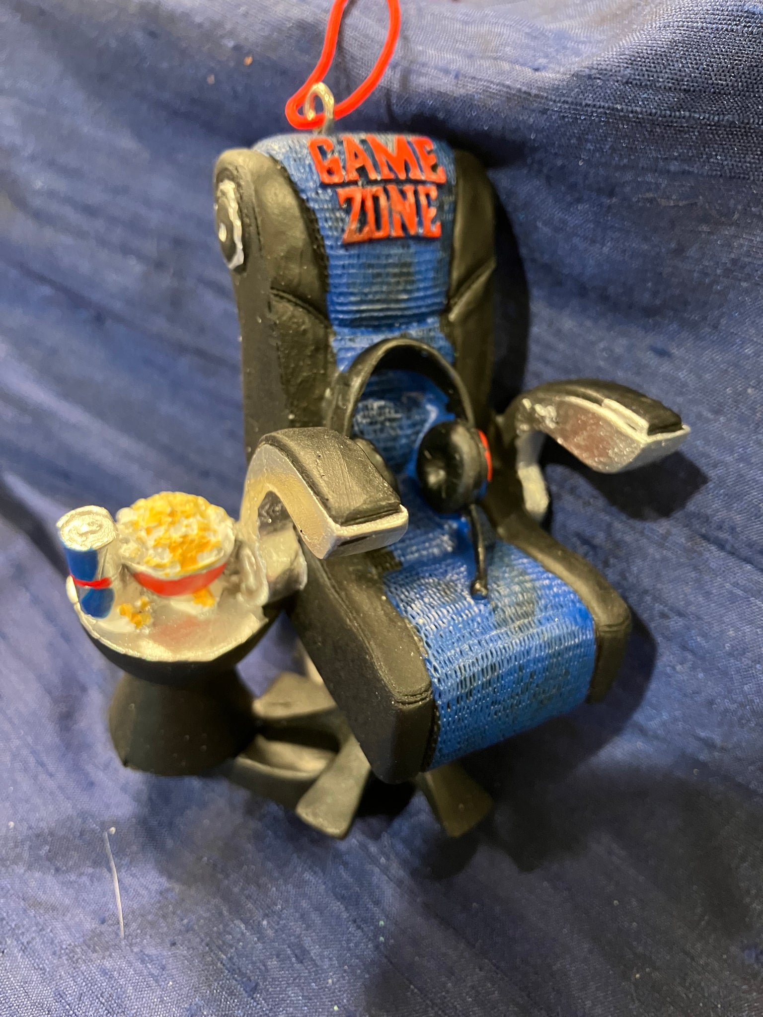 4.5" of handpainted resin, this gaming chair ornament has everything from the snacks to the headset to the controller dangle.