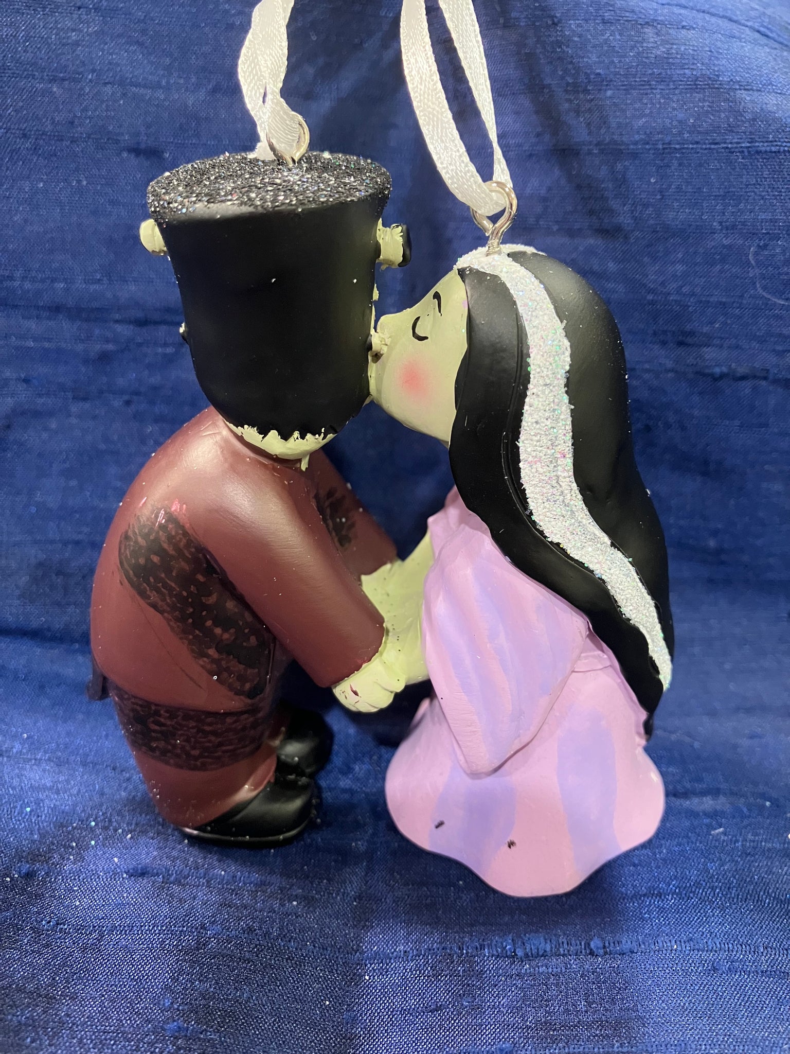 Two precious monsters sharing a smooch; this 4" resin ornament might also make a good topper for a small Halloween themed wedding cake.