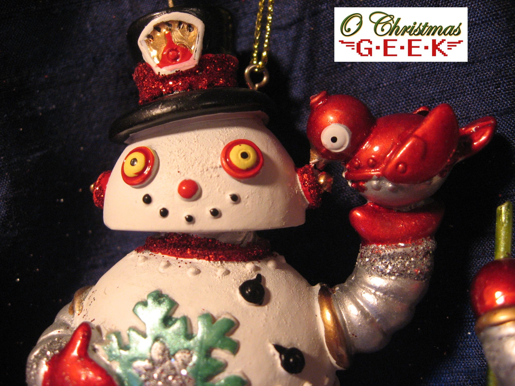 This husky and adorable Mid-Century Modern snowbot is perfect for the tree or stocking of your favorite mad inventor. 4" of handpainted resin with glitter accent.